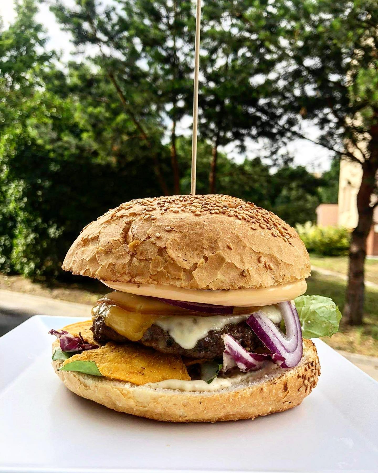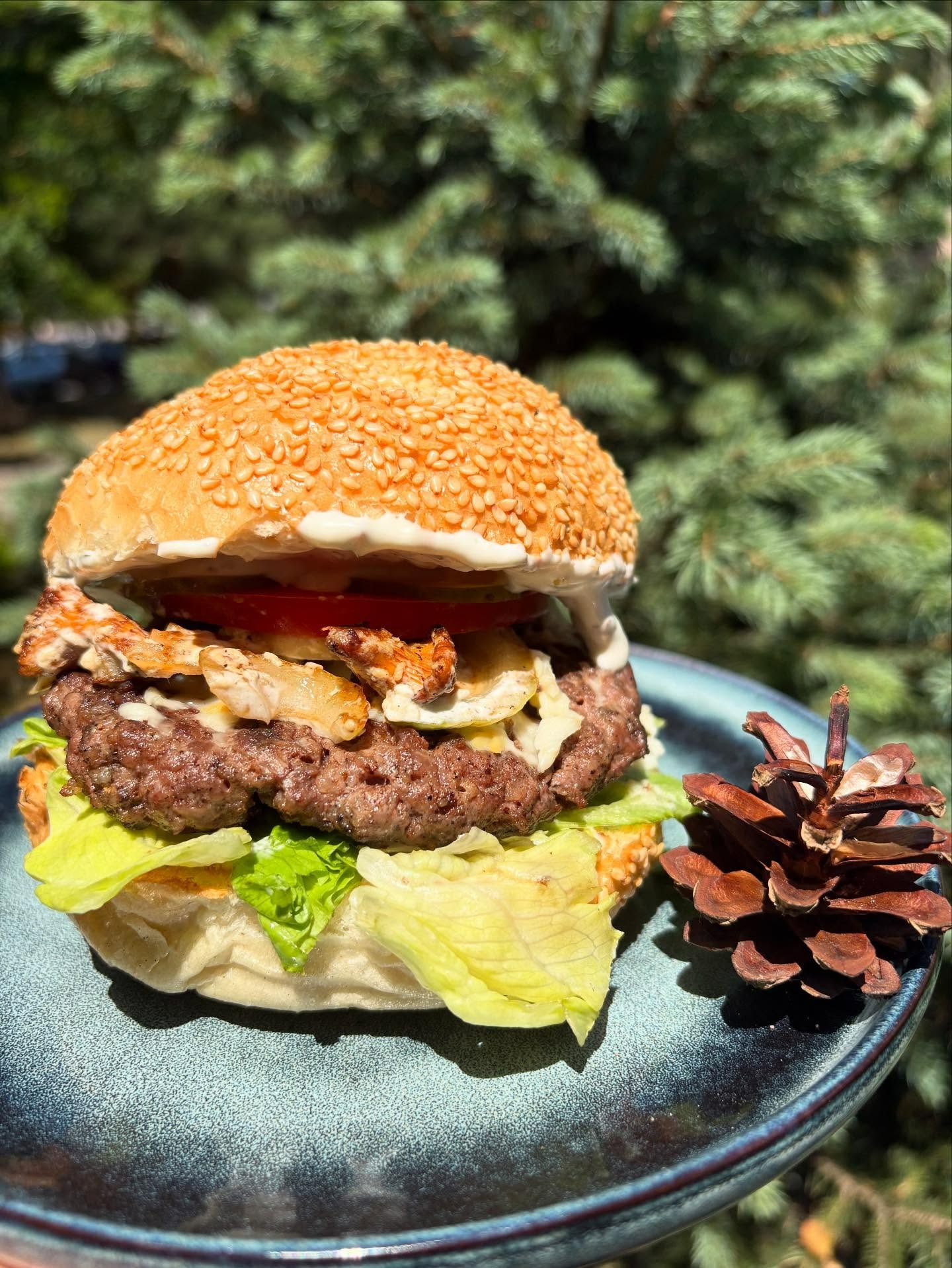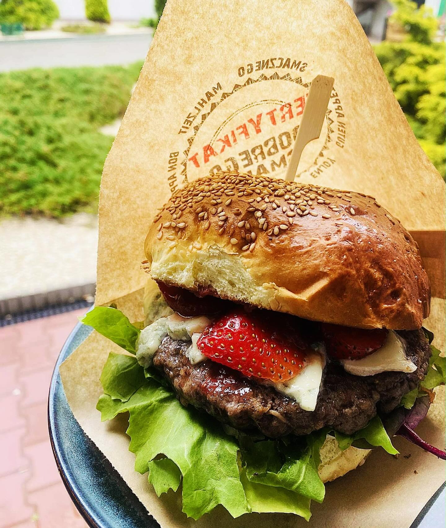 mięso, oscypek, bekon, grillowana biała cebula, sałata, pomidor, ogórek, sos żurawinowy, sos majonezowo - musztardowy -