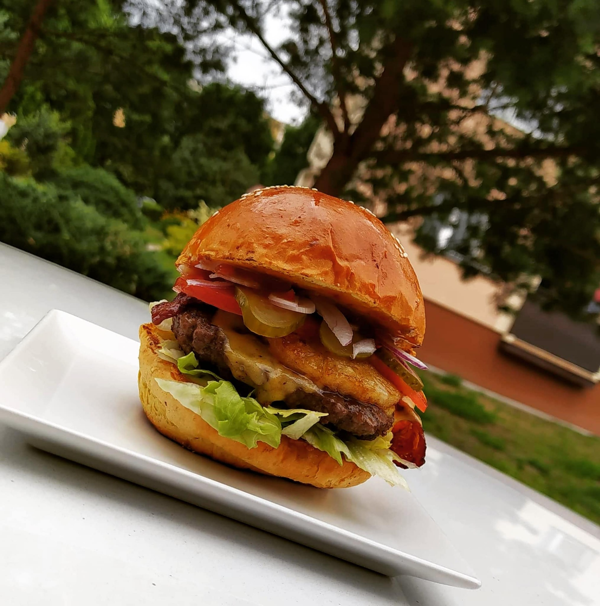 bułka, mięso, grillowany ananas, bekon, ser cheddar, pomidor, ogórek konserwowy, cebula czerwona, sałata, sos majonezowo- musztardowy i zamiennie mango jalapeno lub sezamowy -