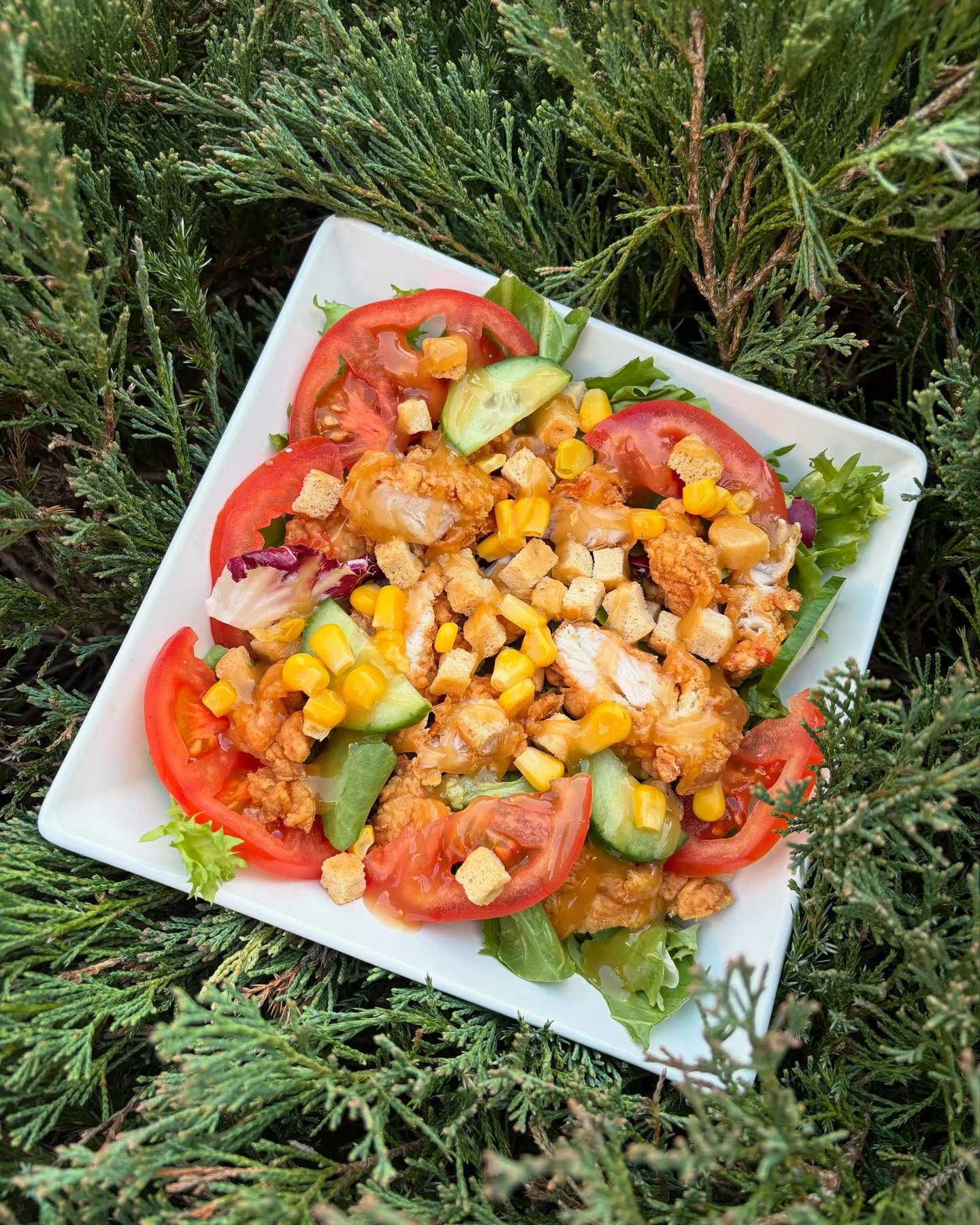 mięso, placek ziemniaczany, grillowana kiełbasa i biała cebula, sałata, pomidor, ogórek, sos tatarski, sos majonezowo - musztardowy -