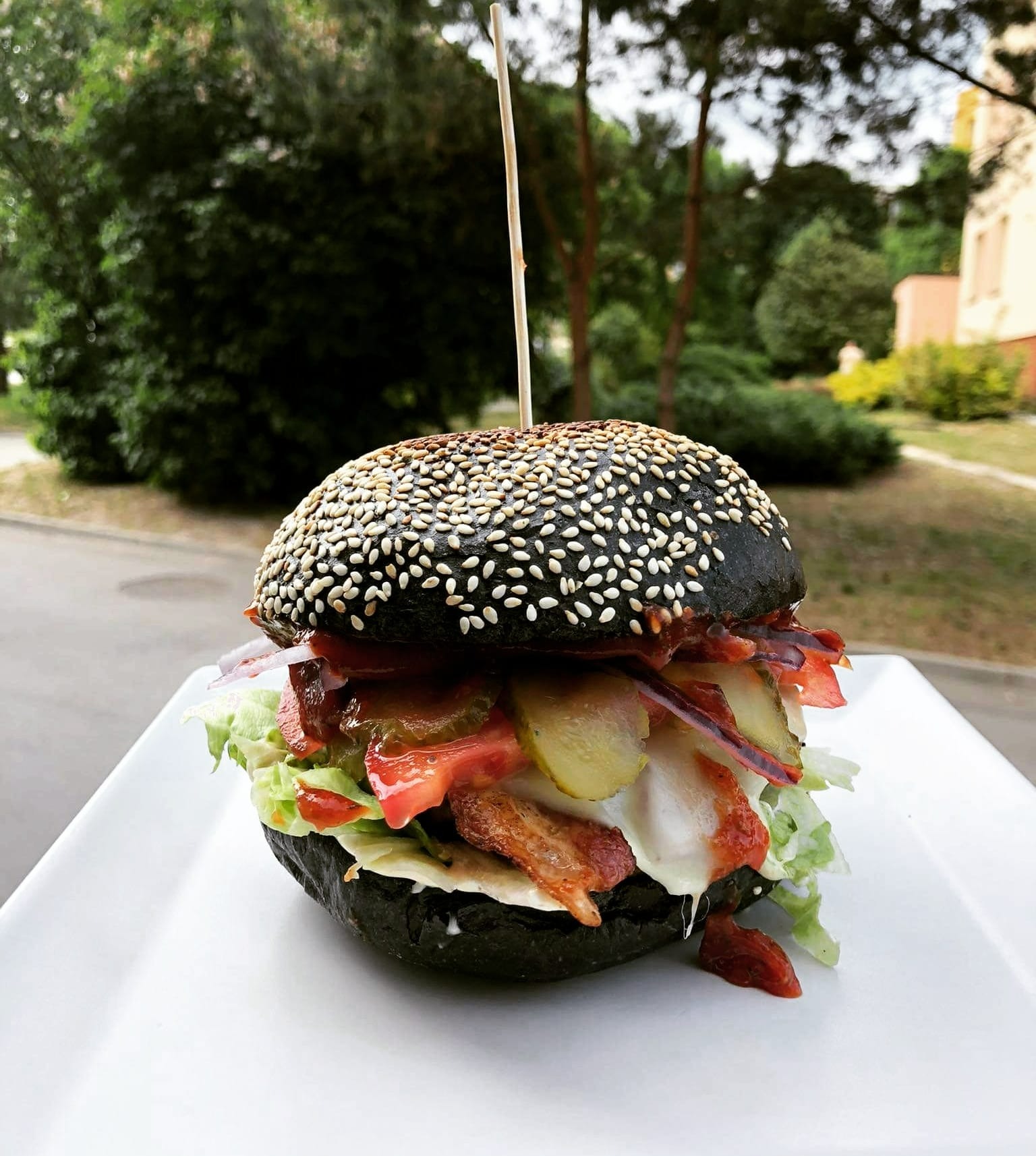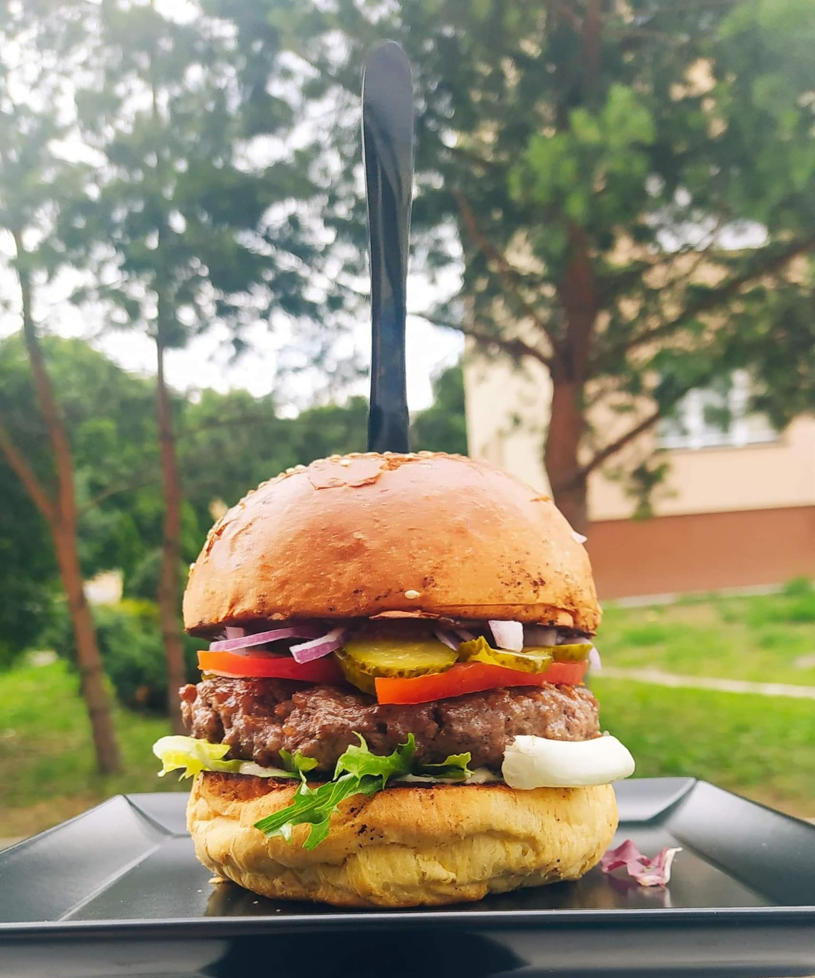 mięso, bekon, cebulka prażona, sałata, pomidor, ogórek, cebula czerwona, sos BBQ, sos majonezowo - musztardowy -
